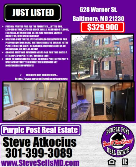 PRE-GAME FOR RAVENS AND ORIOLES GAMES DIRECTLY ACROSS THE STREET FROM THE STADIUMS!!!! LONGTIME OWNER FINALLY SELLING THIS SPARKLING GEM! FRESHLY PAINTED AND ALL THE AMENITIES.....JETTED TUB, EXPOSED BEAMS, EXPOSED BRICK WALLS, HARDWOOD FLOORS, FIREPLACE, CERAMIC TILE BATHS AND KITCHEN, GRANITE COUNTERS, RECESSED LIGHTING! RARE END-UNIT THAT IS LAST OF ROW TO THE BEAUTIFUL AND PICTURESQUE DOG PARK! HISTORIC RIDGLEYS DELIGHT IS THE PLACE TO BE FOR GREAT NEIGHBORS AND QUICK ACCESS TO DOWNTOWN, OR OUT-OF-TOWN! GROUND RENT WAS REDEEMED YEARS AGO AND THIS ONE IS A FEE SIMPLE PROPERTY THAT LENDERS LOVE! HOME IS BEING SOLD AS-IS BUT IS NEARLY PERFECT!! REALLY A RARE OPPORTUNITY TO INHERIT THIS HISTORIC YET MODERNIZED SHOWPIECE!!!