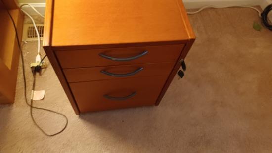Beautiful teak file cabinets w/two drawers with dividers plus sliding trays, one file cabinet drawer with letter size (not legal) hanging folder frame, and wheels to easily move around. Drawers have interlock to prevent tipping and each has 2 keys. These are really nice, I’m sure I’ll regret selling them one day… Width/Depth/Height” = 17/26/23”.