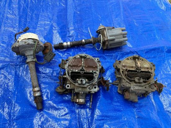 two quadrant carbs, two distributors, 1 is a HEI, core support, one big block 4 bbl intake,, brackets, pulleys etc... all or separate